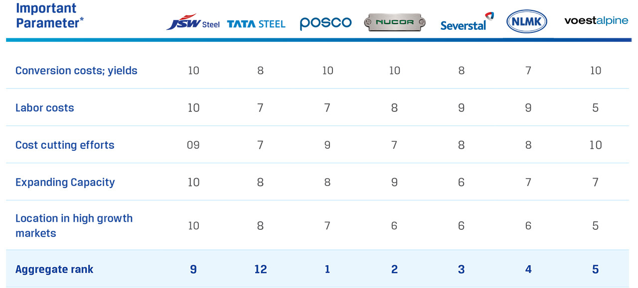 Select parameters where JSW Steel was assigned a high score. The aggregate ranking is on the basis of weighted average score across 23 different parameters