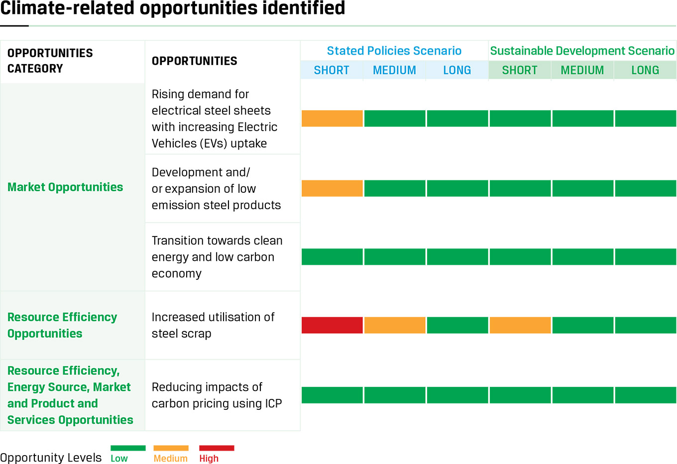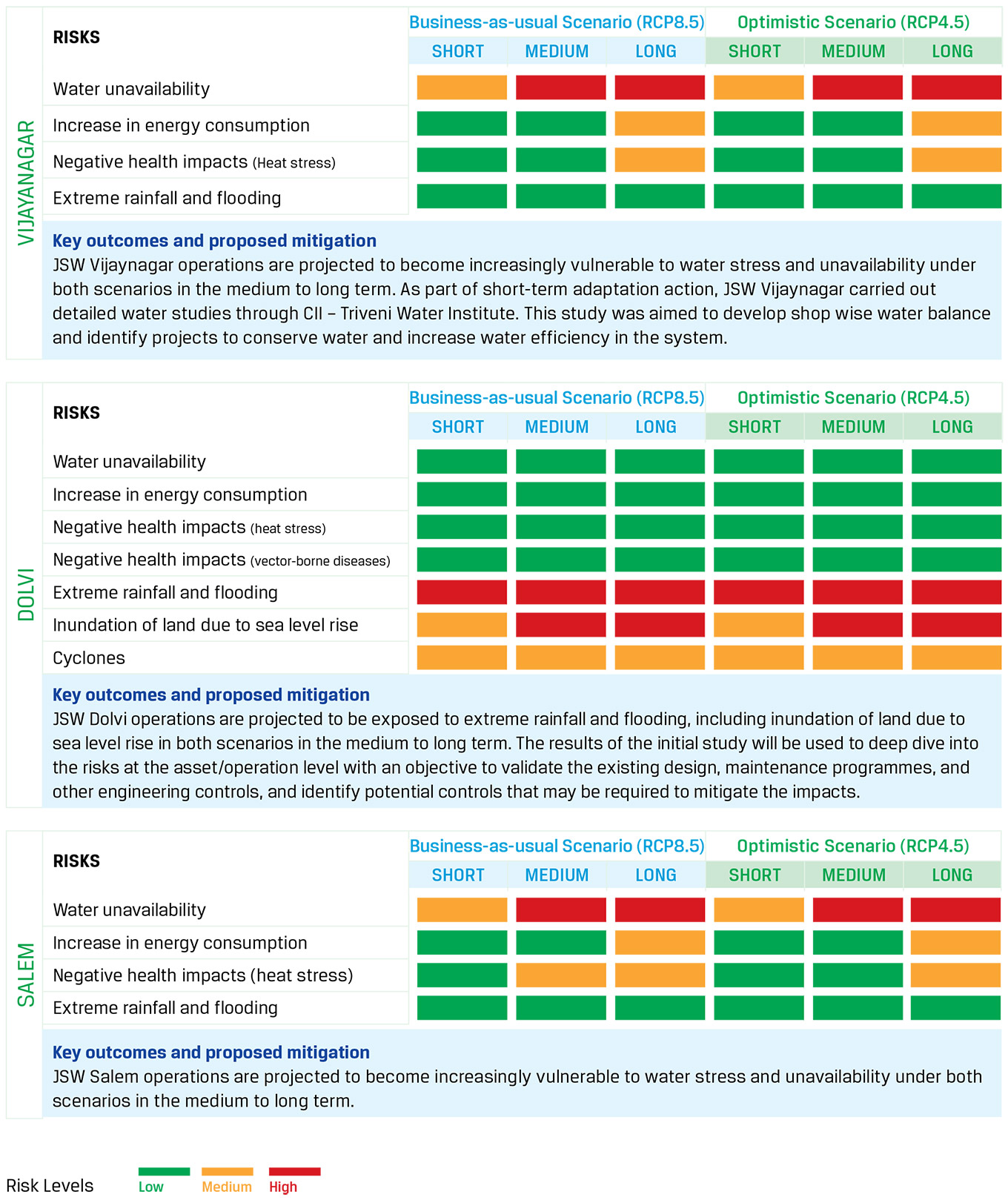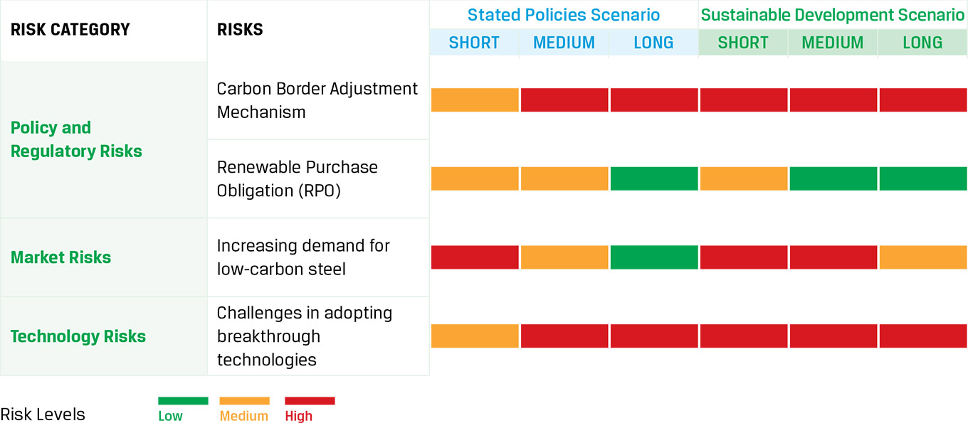 The results of scenario analysis indicate that failure to comply with emerging climate-related policies and regulations particularly, carbon pricing and EU CBAM are most significant risks for JSW Steel. While these policy and regulatory risks are material under both Business-as-usual and Optimistic scenarios, their impact increases significantly under the Optimistic scenario particularly, in the medium and long-term.