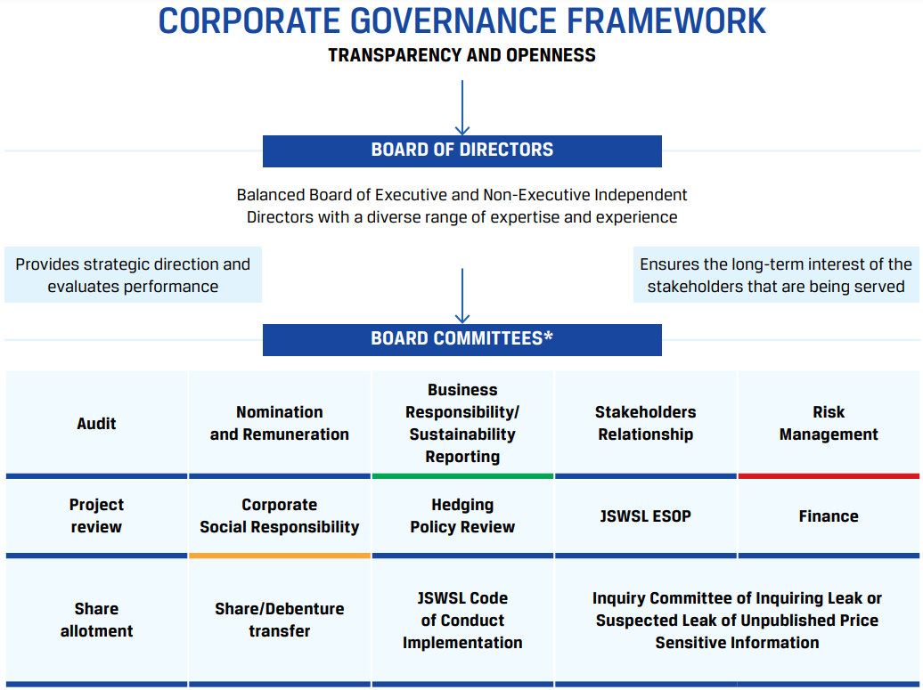 Responsible for the adoption of National Guidelines on Responsible Business Conduct (NGRBC) in the business practices of JSW Steel. The committee also overlooks matters related to climate change, water and biodiversity and guides required actions for these sustainability practices.
