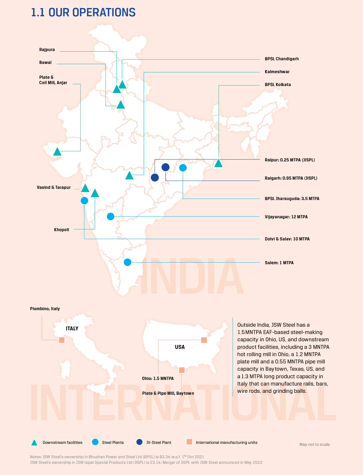 The Company has strategically positioned itself in key locations across India, the USA, and Italy, gaining significant advantage. The majority of the production capacity is met by the Company's four Integrated Steel Plants (ISPs) located in Vijayanagar, Dolvi, Salem, and Odisha. In addition to the ISPs, the market presence is strengthened by the value-added steel products (VASP), which the Company offers through its JVs and subsidiaries.