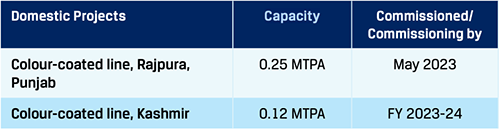 JSW Steel is currently expanding its downstream capacity with the installation of a new 0.25 MTPA colour-coated line at Rajpura (Punjab), commissioned in May 2023, and the setting up of a 0.12 MTPA colour-coated facility in Jammu and Kashmir in FY 2023-24. Both these downstream facilities are expected to be commissioned during FY 2023-24.