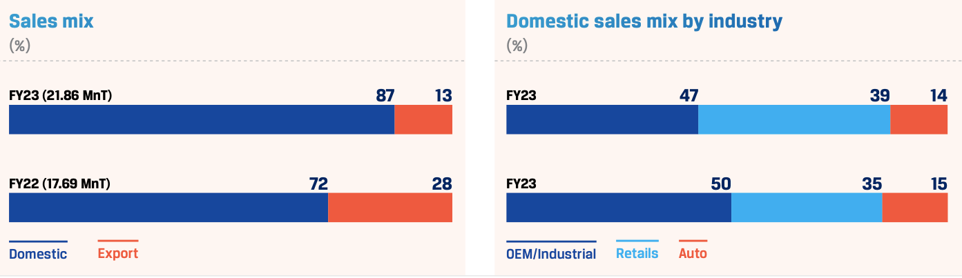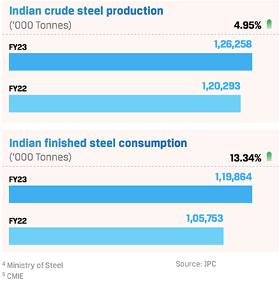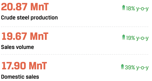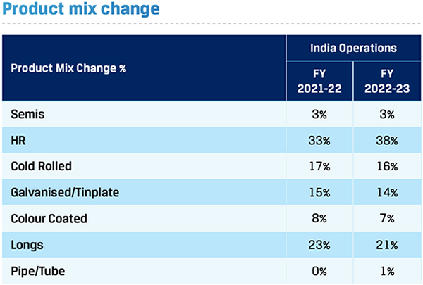 During FY 2022-23, JSW Steel achieved 90% capacity utilisation and reported highest ever consolidated crude steel production of 24.16 MnT, up 24% y-o-y, on strong domestic demand. India operations sales stood at 21.86 MnT, up 24%.