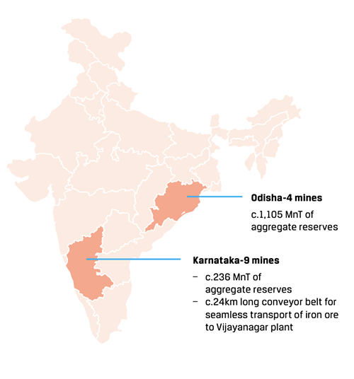 JSW Steel currently operates 13 captive iron ore mines in Karnataka and Odisha, with aggregate reserves of 1.34 billion tonnes. Its key cost-reduction projects include pellet plant and coke oven facilities at Vijayanagar and Dolvi. The Company has also built the world’s largest conveyor system, which extends 24km, from the captive mines to the Vijayanagar plant, to transport iron ore.