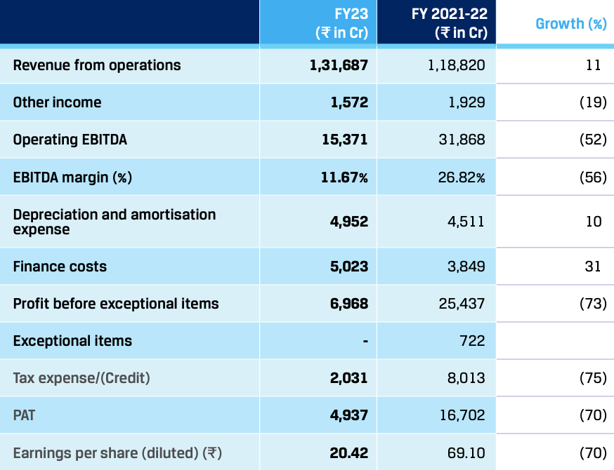 In FY 2022-23, the Company’s consolidated revenue from operations increased by a staggering 13% y-o-y to ₹1,65,960 crore. Operating EBITDA was recorded at ₹18,547 crore. Operating EBITDA reduced mainly due to lower sales realisations, higher coal, power and fuel costs, and lower contribution from US subsidiaries.