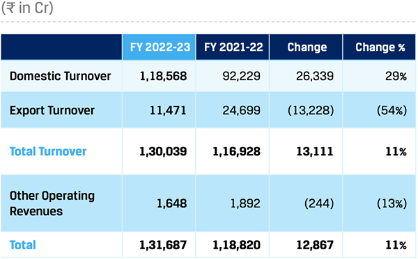 The domestic turnover increased to ₹1,18,568 crore in FY 2022-23 from ₹92,229 crore in FY 2021-22. The domestic turnover increased by 29% y-o-y primarily due to increase in domestic despatch volumes by 38% due to better domestic demand on account of driven by Government infrastructure spend partially offset by decline in sales realisations by 6% due to lower international prices and imposition of export duty. The export turnover was lower at ₹11,471 crore in FY 2022-23 as compared ₹24,699 crore in FY 2021-22. The export turnover declined by 54% y-o-y on account of decline in export volumes by 30% and decline in steel prices.