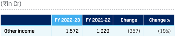 The other income for the previous year included an amount of ₹702 crore representing fair valuation gain on re-measurement of optionally fully convertible debentures held by the Company in one of its joint ventures. This lower income was partially offset by higher interest income from cash balances, higher interest income from loans extended to subsidiaries (including that of previous years) and higher fixed deposits and dividend income received from its investment in subsidiaries and Group companies.