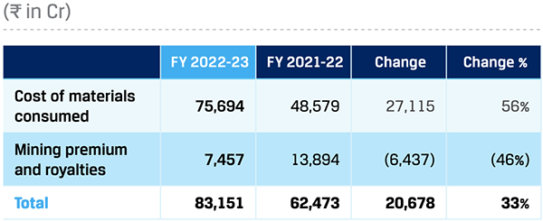 The expenditure on material consumption increased by 56% y-o-y to ₹75,694 crore primarily on account of 58% increase in coking coal costs ($ 333 per tonne in FY 2022-23 vs $ 211 per tonne in FY 2021-22) due to supply chain disruptions and the Russia-Ukraine conflict, increased iron ore procurement from third parties and increased consumption of raw materials due to increase in production volumes by 18%.