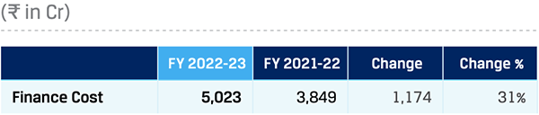 Finance cost increased 31% y-o-y to ₹5,023 crore primarily due to increase in interest rates as the benchmark rates of domestic and foreign currency borrowings increased due to tightening of monetary policies by the central banks to contain inflation. The increase in finance cost is also attributable to full impact of the capitalisation of Dolvi 5 MTPA project carried out in the previous year and other allied assets, capitalisation of Cold Rolling Mill (CRM)1 expansion project at Vijayanagar and cost-saving projects and impact of forex fluctuations as the rupee depreciated by 8.5% during the year.