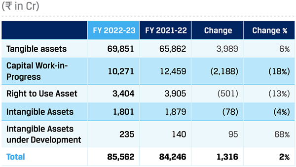 Net block of Property, Plant and Equipment increased by ₹3,989 crore primarily on account of capitalisation aggregating to ₹8,502 crore CRM1 expansion, battery A of coke oven 5 of capacity 0.75 MTPA at Vijayanagar, 235 MW captive power plant at Dolvi, mining equipment at Odisha and cost saving projects and sustenance capital expenditure offset by depreciation charge for the year. The capital work-in-process decreased to ₹10,271 crore on account of lower capital expenditure incurred during the year as against the capitalisation carried out during the year.
