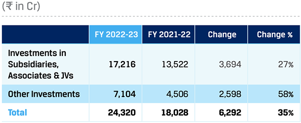 Investments increased to ₹24,320 crore due to an additional investment of ₹6,728 crore, primarily in equity investments in JSW Vijayanagar Metallics Limited to set up the 5 MTPA steel project at Vijayanagar, JSW Paints Private limited and purchase of Piombino Steel Limited Non-convertible Bonds. This increase in investments was partially offset by decrease in investments ₹435 crore, mainly attributable to decline in share price of JSW Energy Limited.