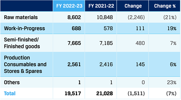 The decrease in inventory was primarily on account of a decrease in coking coal inventory by ₹2,702 crore as coal inventory reduced by 5.5 lakh tonnes and coal prices fell by 16% to ₹23,348 per tonne. The work- in-progress and semi-finished/finished goods increased by ₹591 crore primarily due to increase in steel inventory by 2.27 lakh tonnes.