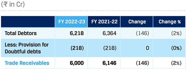 Trade receivables marginally declined to ₹6,000 crore. However, the average collection period as on March 31, 2023, was 17 days compared to 15 days as on March 31, 2022, primarily on account of market sentiment.