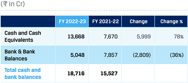 Cash and bank balances increased to ₹18,716 crore from ₹15,527 crore primarily on account of cash surplus generated in the fourth quarter due to liquidation of working capital.