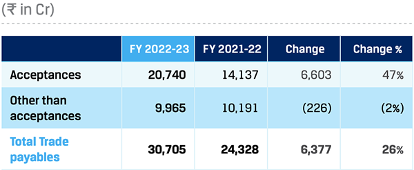 Trade payables increased by ₹6,377 crore primarily due to increase in acceptances caused by increase in coking coal price and other coal prices due to supply chain disruptions and the Russia-Ukraine conflict.