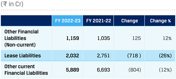 Other current financial liabilities increased by ₹125 crore to ₹1,159 crore mainly due to increase in allowances for financial guarantees. Lease liabilities were lower by ₹718 crore to ₹2,032 crore due to repayment of principal amount on leases and modification of certain leases which is partially offset by increase in lease liabilities for certain logistics assets taken on lease. The other current financial liabilities decreased to ₹5,889 crore due to payment of liabilities towards bid premium/royalties for own mines and reduction in retention money for capital projects.