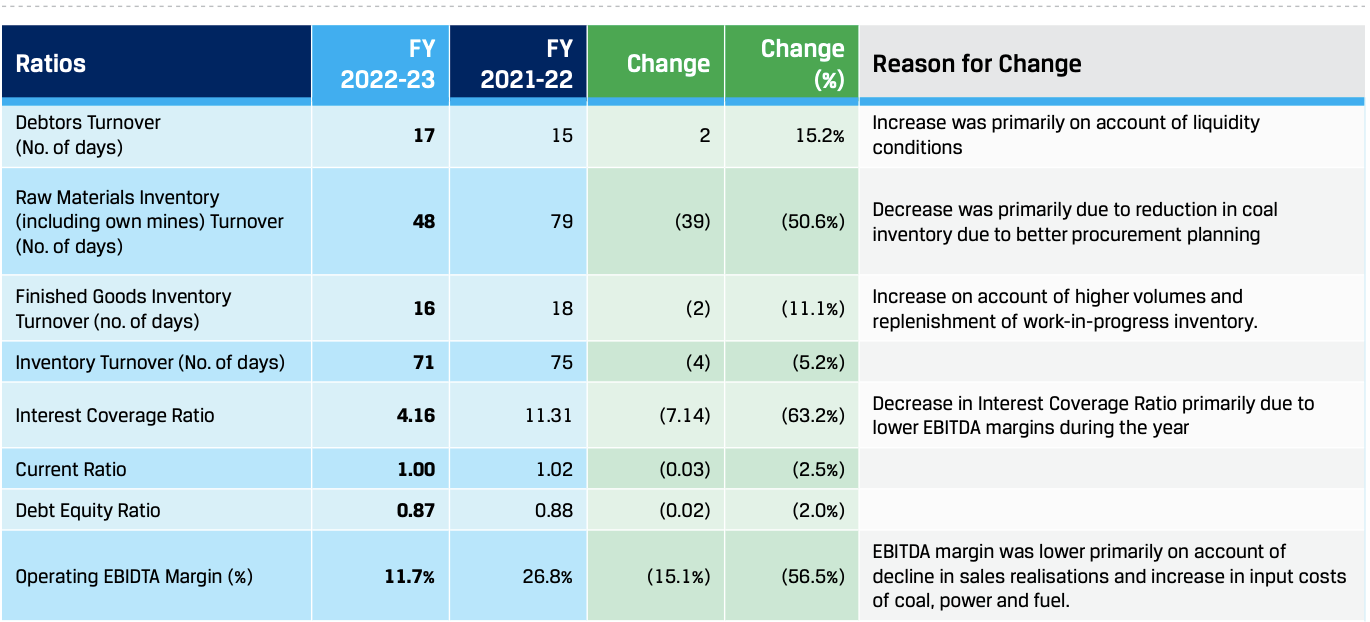 Average raw materials inventory (including own mines’ iron ore) holding as on March 31, 2023 decreased to 48 days from 79 days as on March 31, 2022 primarily due to the reduction in lower coking coal inventory.