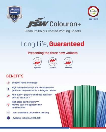 Colouron+ now comes with a warranty of 15 years. This enables us to build on the trust in our consumer’s mind and establish JSW Steel as a preferred choice in the category. Colouron+ is also now Green Pro Certified, fulfilling the promise of building a better tomorrow with sustainable products, keeping our environment and future generations in mind.
