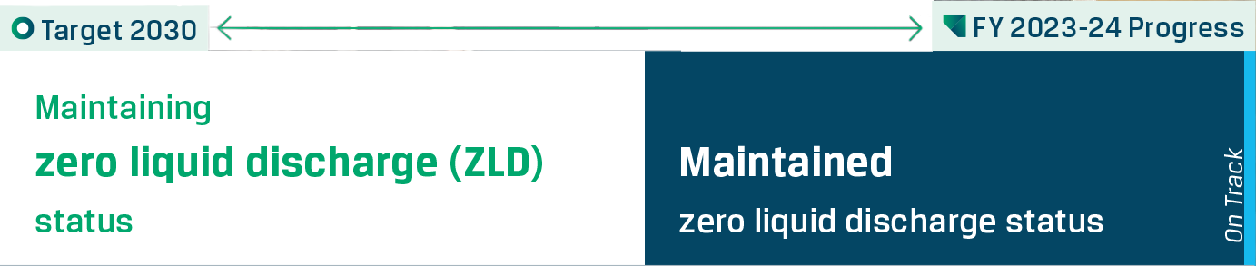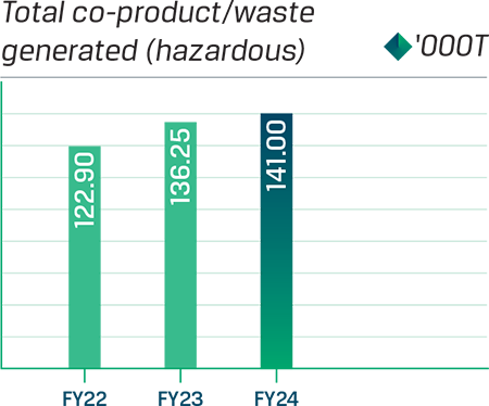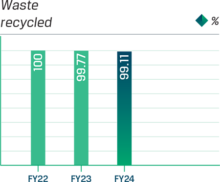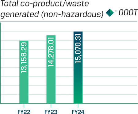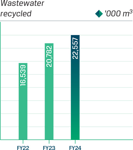 By implementing treatment and recycling facilities, we have achieved Zero Liquid Discharge, with approximately 42,850 m3/day of effluent re-circulated and reused at the plant. Desilting one guard pond has enhanced its capacity, improving effluent neutralisation and supporting increased secondary usage.