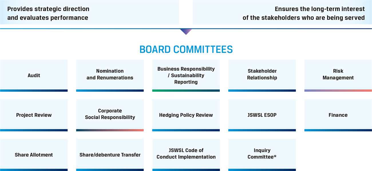 Under the guidance of the Board and its committees, JSW Steel drives performance by adopting various policies on key domains such as corporate governance, sustainability and CSR. Respective information on the policies is available at our website