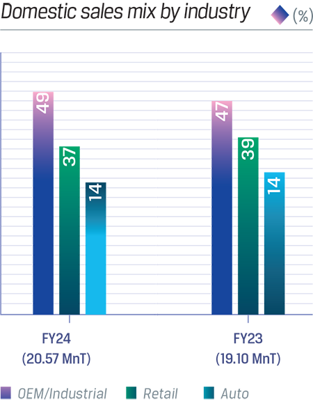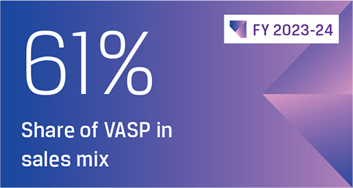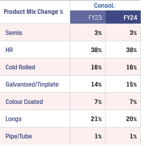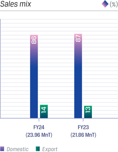 During the year under review, the Company reported its highest ever annual steel sales volume of 24.78 MnT, up by 11% y-o-y. The consolidated India operations export of steel products stood at 3.4 MnT, up by 23% y-o-y and accounting for 14% of the total sales, as against 13% in FY 2022-23. The exports of steel products were higher in FY 2022-23 as there was no export duty levy during the year as compared to export duty levy of 15% between May 2022 and November 2022. The consolidated India operations domestic sales stood at 20.57 MnT an increase of 8% y-o-y, driven by domestic demand for steel. The Company achieved its highest year Value-Added Special Products (VASP) sales at 14.65 MnT, an increase of 19% y-o-y, and accounted for 61% of the total sales volume for the year.