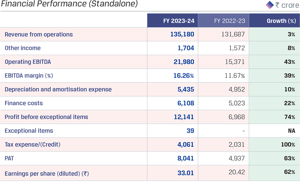 Consolidated operating EBITDA was `28,236 crore, an increase of 52% y-o-y with an EBITDA margin of 16.1%. EBITDA per tonne was `11,394 crore during FY 2023-24, higher by 38% y-o-y, primarily on account of the decline in coking coal prices and power and fuel costs, partially offset by lower sales realisations.