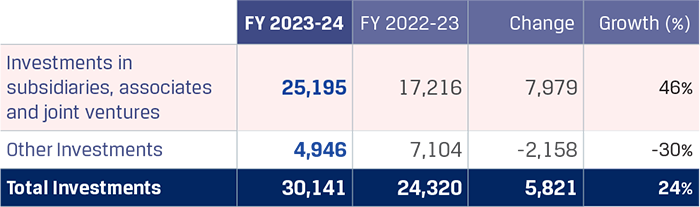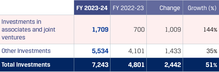 Investments increased to `7,243 crore from `4,801 crore in FY 2022-23, an increase of `2,442 crore due to increase in fair value of JSW energy shares by `2,927 crore, additional investment of `250 crore in JSW Paints, partially offset by reduction in investment in Creixent Special Steels Limited of `760 crore pursuant to the merger of CSSL with the Company effective July 31, 2023.