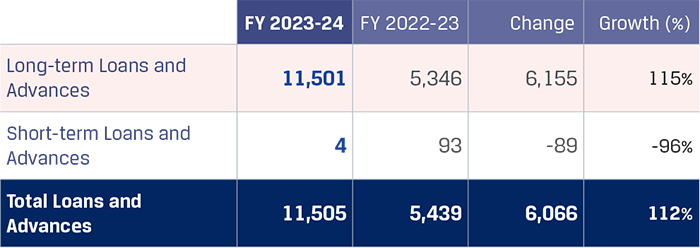 Loans and advances increased primarily due to loan extended to JSW Vijayanagar Metallics Limited amounting to `1,276 crore for setting up the 5 MTPA steel project at Vijayanagar, additional loan extended to Piombino Steel Limited, amounting to `3,144 crore for redeeming the Non-convertible Bonds issued by them and loans extended to overseas subsidiaries to cater to the interest and principal repayment obligations.