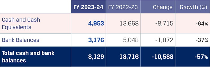 To meet short-term cash commitments and repayment obligations, the Company parks surplus funds in short-term and highly liquid instruments which represent cash and cash equivalents and other bank balances. Total cash and bank balances decreased to `8,129 crore from `18,716 crore primarily on account of lower cash and bank balances due to a reduction in term deposit accounts with maturity less than 3 months at inception and a reduction in maturity more than 3 months but less than 12 months at inception as the cash and bank balances were utilised for capex and working capital requirements.