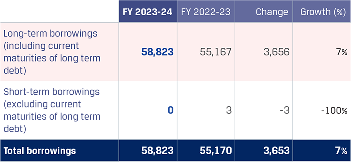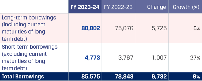 Long-term borrowings (including current maturity of long-term debt) increased primarily due to the net drawing of secured term loans by `1,651 crore, net increase in unsecured term loans by `2,288 crore for incurring capital expenditure and general corporate purposes which was offset by the net redemption of debentures by `840 crore. Deferred government loans increased by `316 crore.