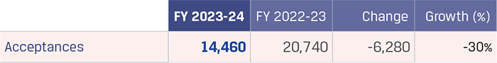 Acceptances decreased by `6,280 crore to `14,460 crore during FY 2023-24 due to decline in coking coal prices and repayment of acceptances.