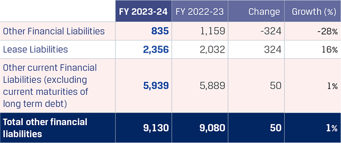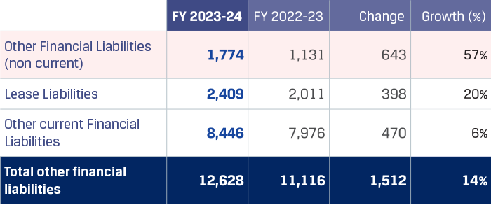 Other financial liabilities increased by `643 crore to `1,774 crore primarily on account of increase in retention money payable for capital projects. Lease liabilities increased by `398 crore to `2,409 crore primarily on account of addition in lease liabilities for railway wagons taken on lease, increase in lease liabilities pursuant to contracts entered for cargo handling at ports and lease assets acquired as a result of the JISPL merger, partially offset by the repayment of principal amount on leases. Other current financial liabilities increased by `470 crore to `8,445 crore primarily on account of increase in interest accrued but not due on borrowings, higher provisions for marketing rebates, payable for capital projects, which was partially offset by the decrease in retention money payable for capital expenditure.