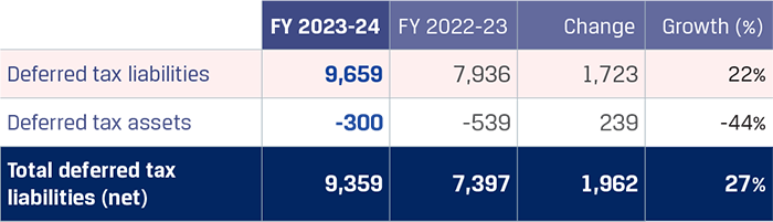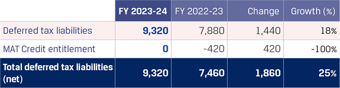 Deferred tax liabilities increased by `1,440 crore to `9,320 crore, primarily on account of additional liability recognised due to adoption of new tax regime wherein deferred tax assets / liabilities are re-stated from 34.94% to 25.17% and utilisation of tax losses acquired pursuant to merger with JISPL. MAT credit was written off due to transition to the new tax regime.