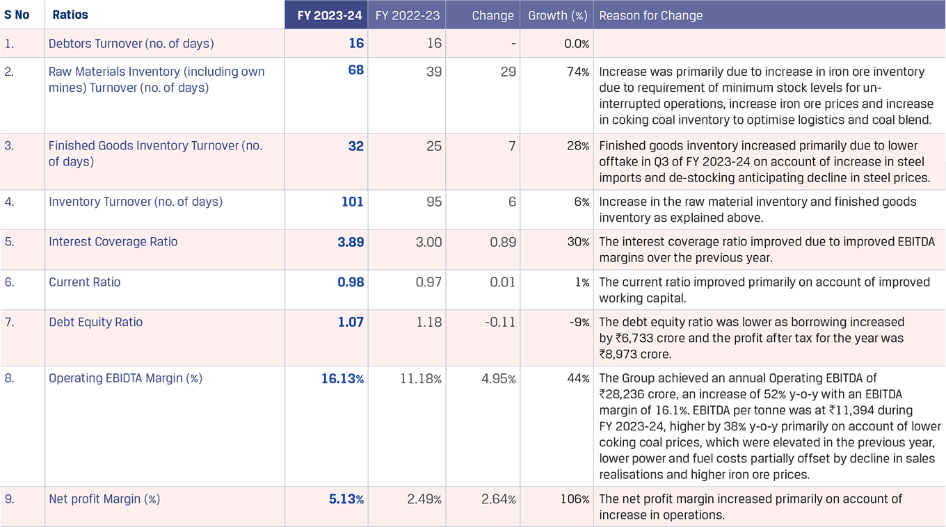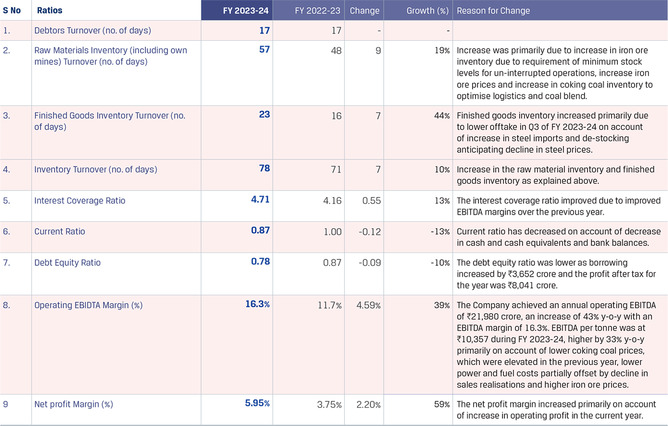 The increase in inventory was primarily due to an increase in iron ore fines and coking coal inventory by `1,444 crore as iron ore fines inventory increased by 7.21 lakh tonnes with iron ore prices increasing by 19% in FY 2023-24. The coal inventory also increased by 7.22 lakh tonnes and coal prices fell by 12% in FY 2022-23. Limestone and other raw materials cost witnessed a marginal increase.
