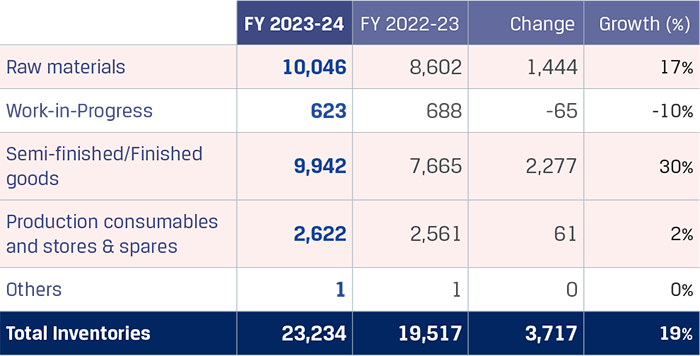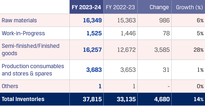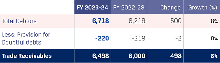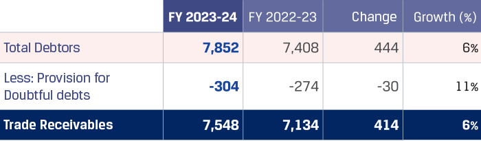 Trade receivables increased by `498 crore to `6,498 crore due to higher sales volumes during the year. However, the average collection period as on March 31, 2024, was maintained at 17 days.