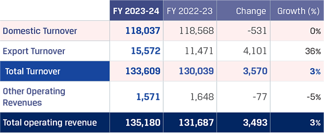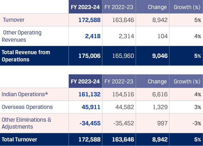 The total turnover increased by `8,942 crore to `172,588 crore in FY 2023-24 from `163,646 crore in FY 2022-23. Turnover from Indian Operations increased by `6,616 crore (4% y-o-y) primarily due to the increase in domestic despatch volumes by 8% y-o-y on account of better domestic demand driven by the Government’s infrastructure spend, partially offset by the decline in sales realisations by 6%. The domestic volume increase was primarily driven by 11% y-o-y growth in the Construction and Infrastructure segment sales, 12% y-o-y growth in the Industrial segment, 5% y-o-y growth in the Auto segment and 3% y-o-y growth in the Retail segment. Export volume was up 23% y-o-y. Export volume contributed 14% in FY 2023-24 as compared to 13% in FY 2022-23 mainly due to higher exports to Europe and the Middle East. The exports of steel products were higher in FY 2022-23 as there was no export duty levy during the year as compared to export duty levy of 15% between May 2022 and November 2022.