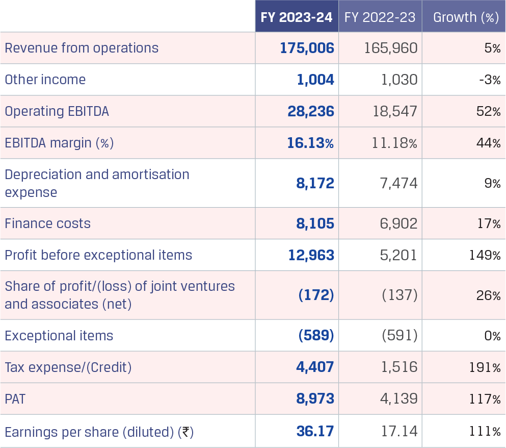 In FY 2023-24, the Company’s consolidated revenue from operations grew by 6% y-o-y to `175,006 crore, primarily on account of the increase in dispatches by 11%, partly offset by lower sales realisations due to decline in international steel prices.
