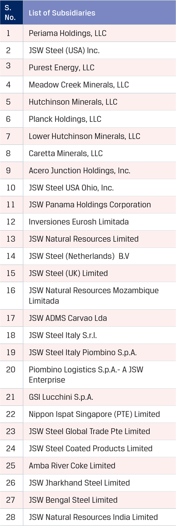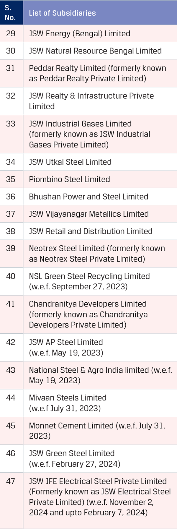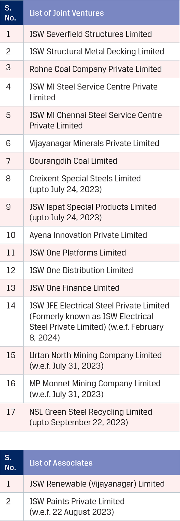 JSW Steel has entered into strategic joint ventures as well as acquired equity interests in various entities which has enabled the Company to add more valueadded products, enhance global footprint, secure raw materials, achieve backward integration and increase technological know-how.