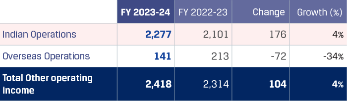 Other operating revenue for Indian operations was `2,277 crore in FY 2023-24 as compared to `2,101 crore in FY 2022- 23, higher by `176 crore. Other operating income increased largely due to higher Government incentive due to lower sales realisation, scrap sales and job work income. This increase was partially offset by reduction in a lower export incentive income as the Company exported under the Advance Authorisation Scheme as against availing duty draw back income in the previous year decrease in Export Promotion Capital Goods (EPCG) grant income.