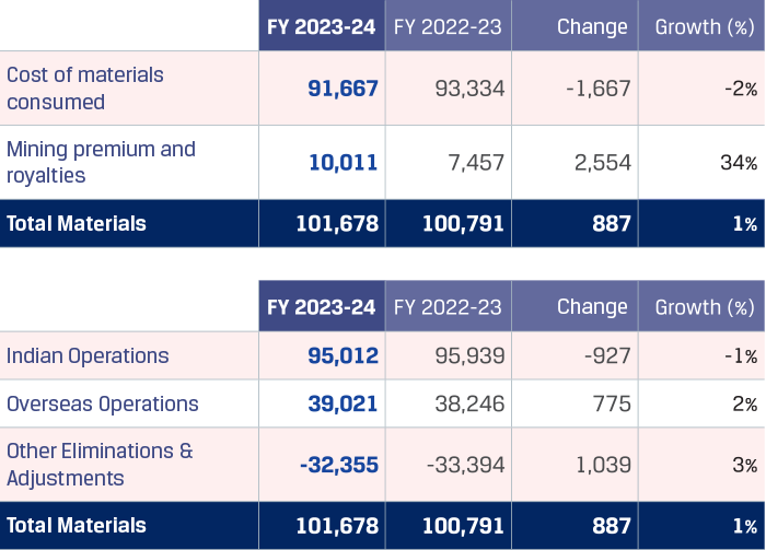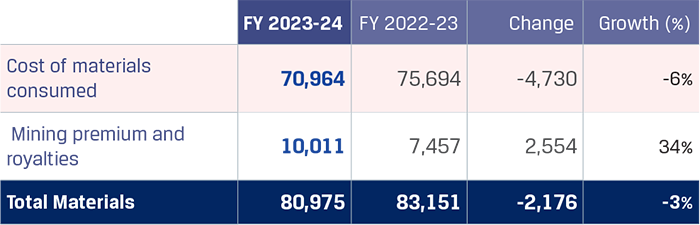 Expenditure on material consumption for Indian operations decreased 1% y-o-y to `95,012 crore primarily on account of 24% decrease in coking coal prices in FY 2023-24 as coking coal prices were higher due to supply chain disruptions and the Russia-Ukraine conflict in FY 2022-23. This decrease on raw materials cost was partially offset by an increase in iron ore cost and increased consumption of raw materials due to increase in production volumes by 8%.