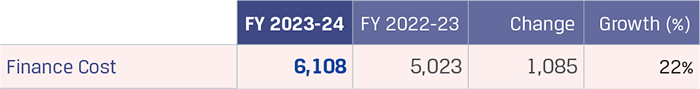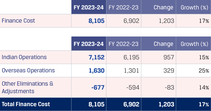 Finance cost increased 17% y-o-y to `8,105 crore primarily on account of higher borrowings and an increase in benchmark rates of domestic and foreign currency borrowings as the central banks across the world increased interest rates to contain inflation. The increase in finance cost was also attributable to increase in borrowings pursuant to merger of JSW Ispat Special Products Limited (JISPL) from July 31, 2023 and increase in interest cost on acceptances as the SOFR rates increased during the year.