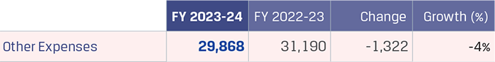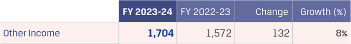 Other income was `1,004 crore in FY 2023-24 as compared to `1,030 crore, lower by `26 crore. Other income was lower due to one-time gain on deemed disposal on dilution of stake in a joint venture of `135 crore, and insurance claim of `30 crore. The decrease is partially offset by increase in interest income from bank deposits by `143 crore.