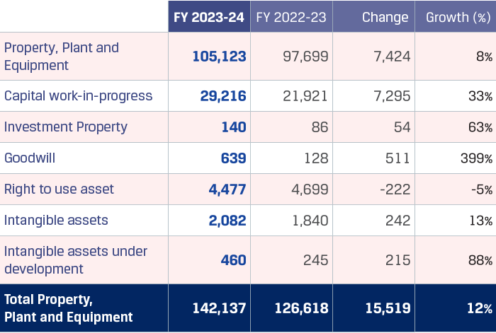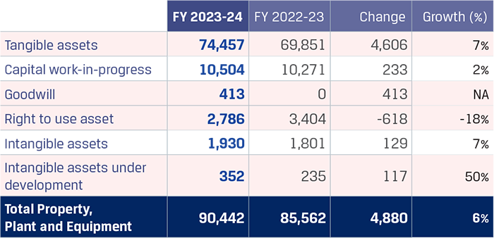 Net block of Property, Plant and Equipment increased by `7,424 crore primarily on account of acquisition of Raigarh and Raipur assets amounting to `3,860 crore pursuant to the JISPL merger becoming effective on July 31, 2023, `511 crore pursuant to acquisition of NSAIL, capitalisation of assets amounting to `10,850 crore relating to Battery B of coke oven 5 of capacity 0.75 MTPA at Vijayanagar, Dolvi Phase II raw material handling system, HSM mill at JVML, special projects and sustenance capex across all the plant locations partially offset by depreciation charge for the year.