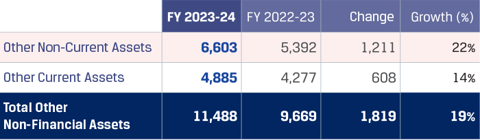 The other Non-current assets increased by `1,211 crore to `6,603 crore primarily on account of accumulation of GST input tax credit and increase in prepaid amounts, which was partially offset by a decrease in the capital advances made to suppliers for capital projects on account of completion of supply of goods or services.