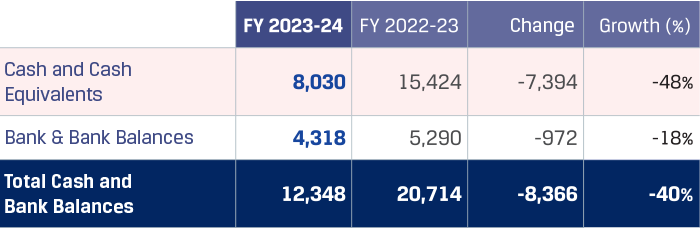To meet short-term cash commitments and repayment obligations, the Company parks surplus funds in short-term and highly liquid instruments which represent cash and cash equivalents and other bank balances. Total cash and bank balances decreased to `12,348 crore from `20,714 crore primarily on account of lower cash and bank balances due to a reduction in term deposit accounts with maturity less than 3 months at inception and reduction in maturity more than 3 months but less than 12 months at inception as the cash and balances were utilised for capex and working capital requirements.