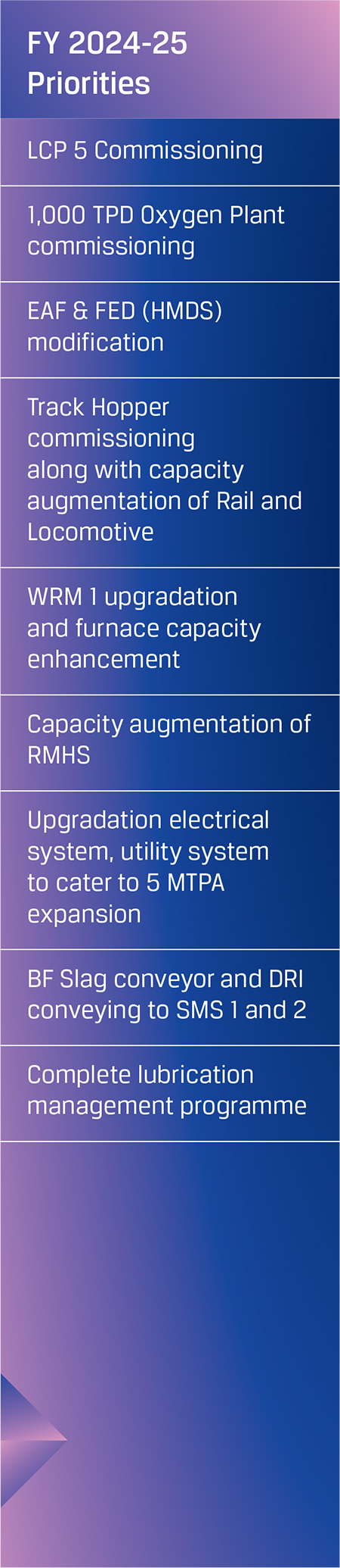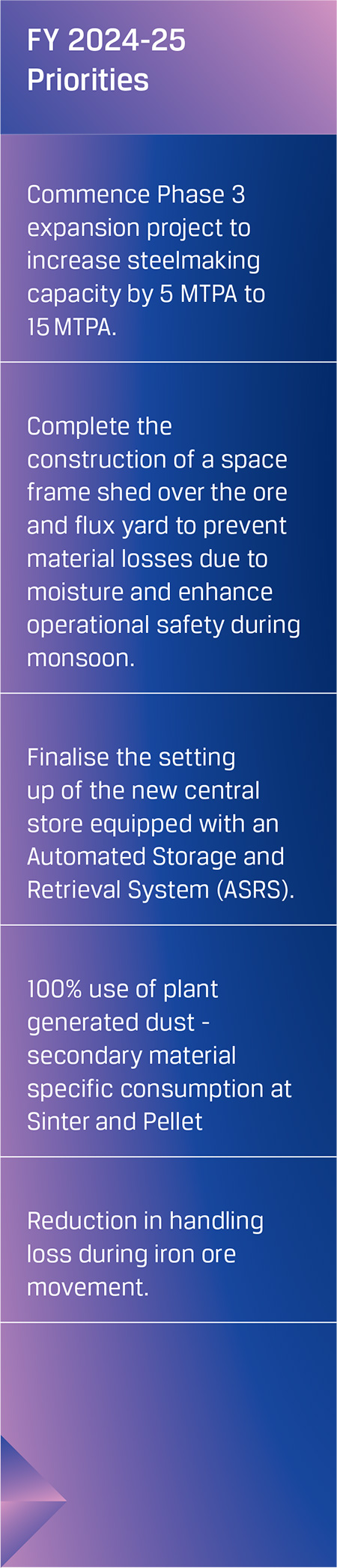 JSW Steel is also setting up a 30 MTPA slurry pipeline from the mines to Jatadhar port, including the grinding and filtration plant. Slated for commissioning in FY 2026-27, the slurry pipeline will provide an environment-friendly logistic solution for transportation of iron ore from Odisha mines to the Jatadhar port and reduce logistics costs. The Company is also setting up an 8 MTPA pellet plant in Odisha for further value addition of iron ore, enhancing its cost competitiveness and raw material security. Further, the Company is setting up coke oven facilities at Vijayanagar to cater to the fuel requirements of the expanded capacities. In addition, the Company has set up and planning to install larger blast furnace of 5 MTPA capacity across its expansion projects for economies of scale and efficient steel making operations.