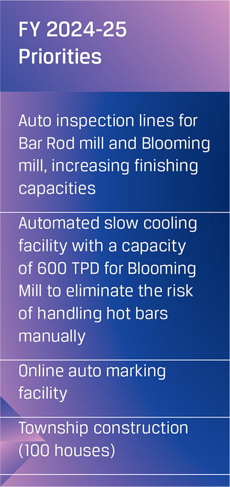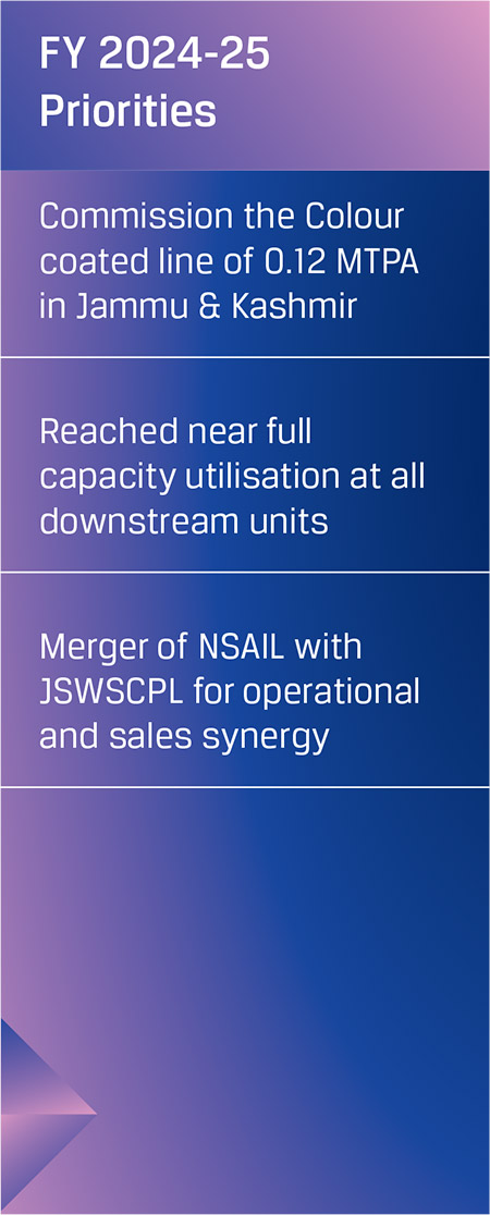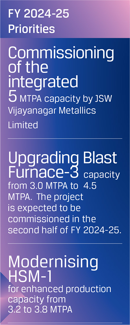 Its fully integrated operations encompass mining, beneficiation, raw materials processing, steel manufacturing and manufacture of downstream value-added products. With a total installed capacity of 29.7 MTPA in India and overseas, JSW Steel has embarked on a transformative growth path that would take its capacity to 38.2 MTPA by FY 2024-25, 43.5 MTPA by FY 2027-28 (September), and further to 51.5 MTPA by the end of FY 2030-31. The Company has earmarked an estimated I64,434 crore as capex to be spent over FY 2024-25 to FY 2026-27 to complete the capacity expansion to 43.5 MTPA, expand downstream capacity, mining projects, cost savings projects, sustaining Capex, and the modernisation of overseas facilities.