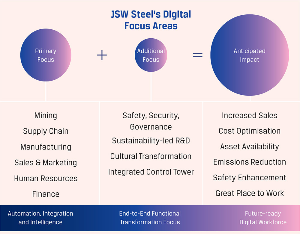 JSW Steel is transforming every aspect of its business by embracing the best available and emergent technologies across functions – Finance, Human Resources, Manufacturing, Mining, Marketing, and Supply Chain. Harnessing the power of Big Data, Advanced Robotics, Hybrid Cloud and Artificial Intelligence, the Company is driving cultural change, augmenting customer experiences, and developing innovative products. Digital initiatives are enabling JSW Steel to improve safety, optimise cost, drive seamless integration of operations, improve product value, and enhance customer delight.