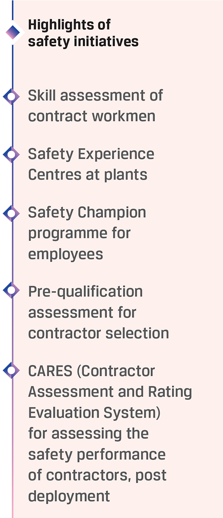 Further, JSW Steel is committed to building a strong health and safety culture, aligned with the Company’s vision of zero harm. It has been investing in capacity building and has undertaken several initiatives that have started delivering results. The Company conducted a Safety Culture Survey of the workforce, including contract workmen at JSW Raigarh. It has also deployed camera-fitted helmets for monitoring high-risk and critical operations in real time at JSW Dolvi and BPSL, among others.