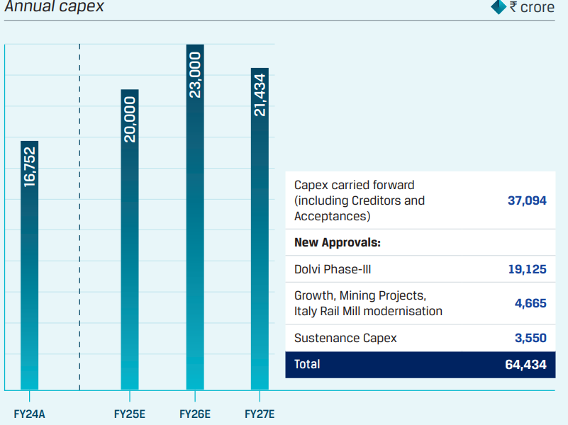 We have outlined a comprehensive capex plan totalling `64,434 crore, spread across the next three financial years. The programme includes carried-forward commitments of `37,094 crore and new approvals amounting to `27,340 crore. Significant investments are allocated for expanding the Dolvi Phase-III project, with an outlay of `19,125 crore to enhance the plant's capacity by an additional 5 million tonnes per annum (MTPA).