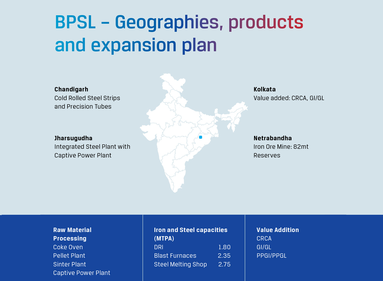 The acquisition further diversifies JSW Steel Group’s presence and provides a strategic access to the fast-emerging market in eastern India. In the near term, we expect to nearly double the capacity at BPSL to augment our overall portfolio.